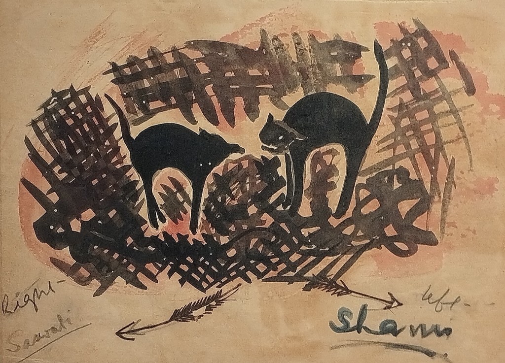 My favourite (among many very fine works!) was a picture of two quarrelsome cats. (In fact, there’s a whole section dedicated to her cats.) Their backs are arched and despite the smooth stroke of the brush, you can almost see them bristling. (Maybe because of the cross-hatched background.) Two arrows below indicate the one on the “right” is Saswati, and on the “left” is Shanu. Was this her take on a fight she had with her friend? Perhaps.