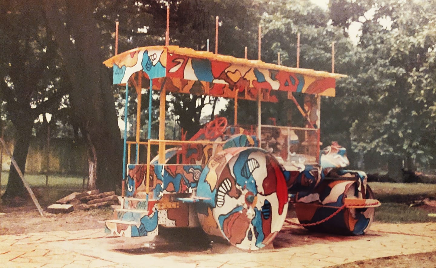 This routine would be livened up for a brief flash once we entered the Dhakuria Lakes from the RKM side. Parked just inside was a road-roller, a fascinating piece of equipment in itself. But to add to the magic of industrial vehicles, this one was a riot of colours. Although the whimsy of something so out-of-place caught my fancy, it never occurred me to find out who was behind it. Many, many years later, I learnt that it was Shanu Lahiri’s handiwork, whose more iconic public sculpture was the “Parama” statue on the EM Bypass. I wish I had seen the famous Philips wall up front.